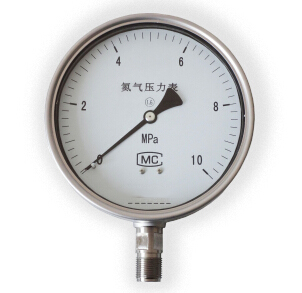 氮气压力表适用于测量密闭容器或者管道内氮气介质的压力的场合,氮气压力表由导压系统、齿轮传动机构、示数装置、和外壳所组成。外壳为气密性结构,能有效的保护内部机件免受环境影响。 主要技术指标: .表盘规格:Ф60 Ф100 Ф150 .精确度等级:2.5级 1.6级 .使用环境条件:-40~70℃,相对湿度≤85% .温度影响:≤0.4%/10℃(相对温度偏离20±5℃)
